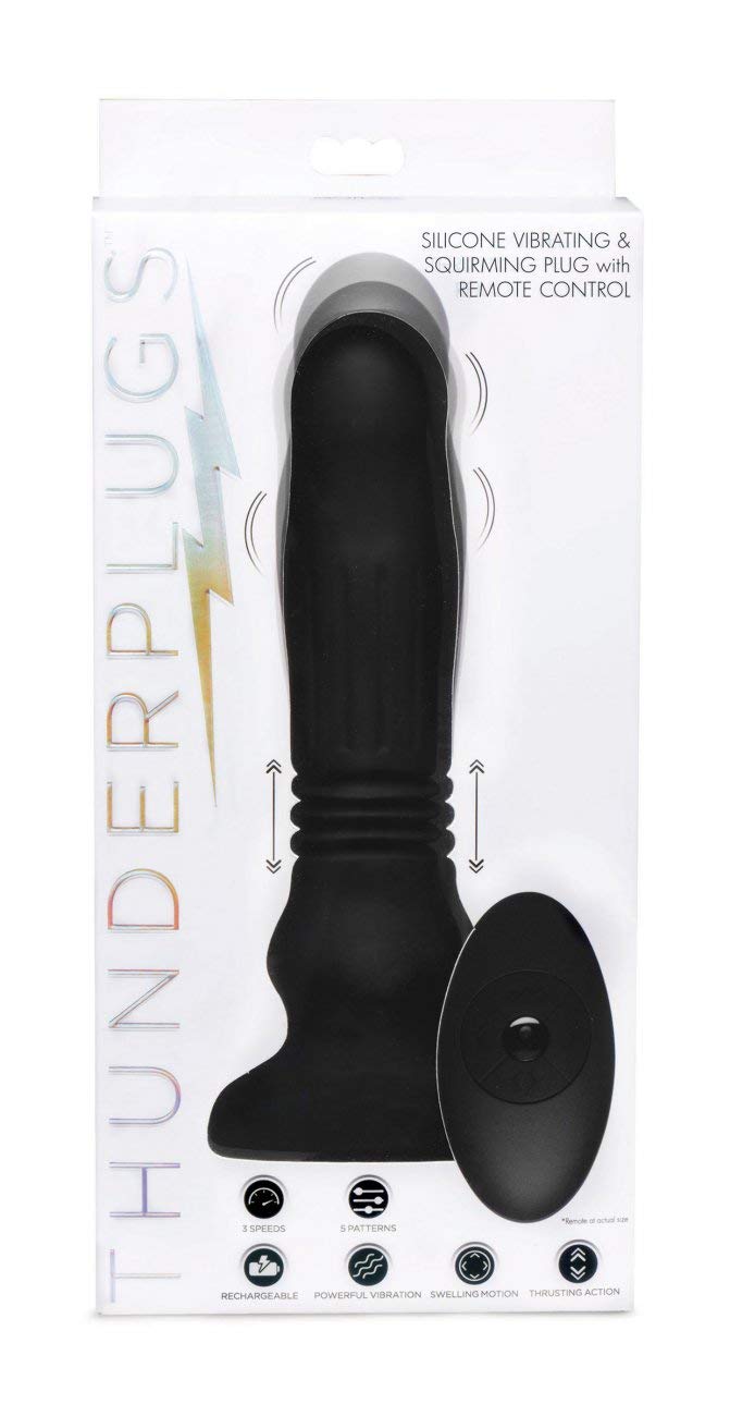 Experience the pleasure as the plug thrusts and gently expands inside you! Experience 3 levels and 5 patterns of vibration, as well as 5 stimulating modes of thrusting and dilating. The ridges along the shaft will massage you as you slide it in and out, but they also serve a function: this plug will stretch out long and bulge wide within you! An optional remote control is included for more convenience during solo play and more excitement during partner play. This rechargeable and waterproof pleasure tool is made of premium silicone for a body-safe experience. This non-porous and phthalate-free material can be cleaned with mild soap or toy cleaner, but is not compatible with silicone lubricants. Measurements: 7.75 inches in total length, 6.75 inches insertable, 1.8 inches at widest diameter. Remote is 3.15 inches in length, 1.7 inches is width. Material: Silicone, ABS plastic. Color: Black. Note: Charges magnetically via USB. Controller uses 1 CR2032 cell battery, included.