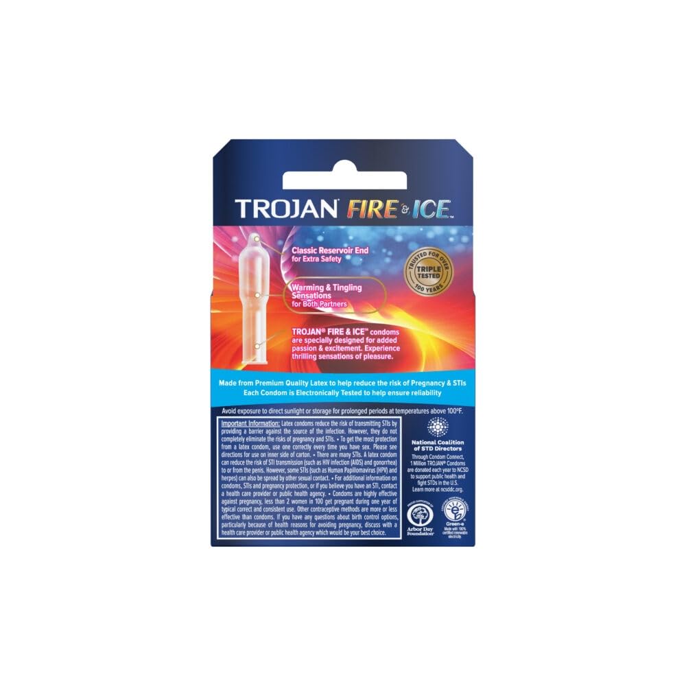 Q: Are Trojan Fire and Ice Condoms safe to use?A: Yes, Trojan Fire and Ice Condoms are made from premium latex, which is tested for safety and reliability when used correctly.