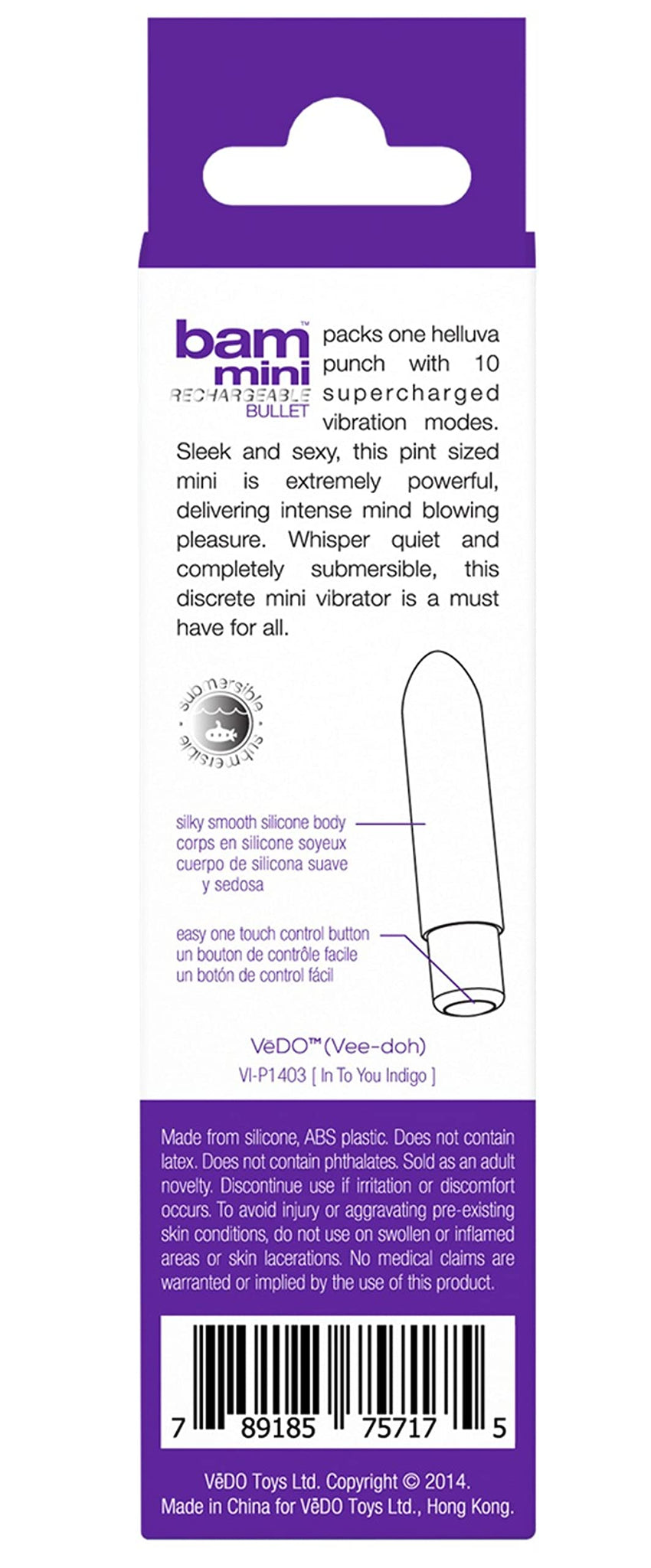 Bam Mini Rechargeable Bullet Packs One Hell Of A Punch With 10 Super Charged Vibration Modes. Sleek And Sexy, This Pint Sized Mini Is Extremely Powerful, Delivering Intense Mind Blowing Pleasure. Whisper Quiet And Completely Submersible, This Discreet Mini Vibrator Is A Must Have For All. Product Features: Powerful Motor. Rechargeable. Usb Cable Included. 10 Vibration Modes. One Button Easy Control. Extremely Quiet. Velvety Smooth Silicone. Designed For An Easy Insertion. Waterproof Vibrations. Running Time 1 Hour. Approximate Size 3.77 Inches By Maximum Diameter 0.78 Inches.