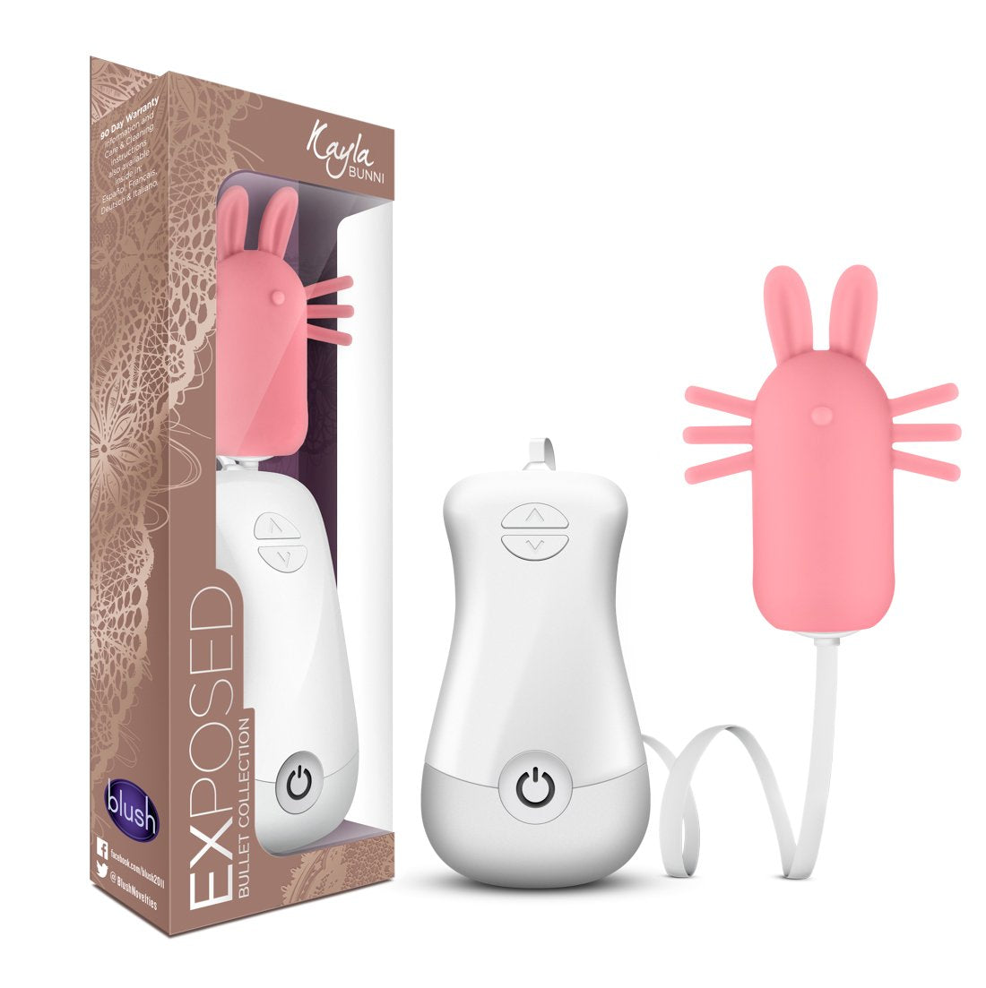 A: The Blush Kayla Bunny vibrator features deep rumbly vibrations with 10 unique vibration functions, a satin smooth finish made from platinum cured silicone, and a convenient two-button remote control for easy operation.