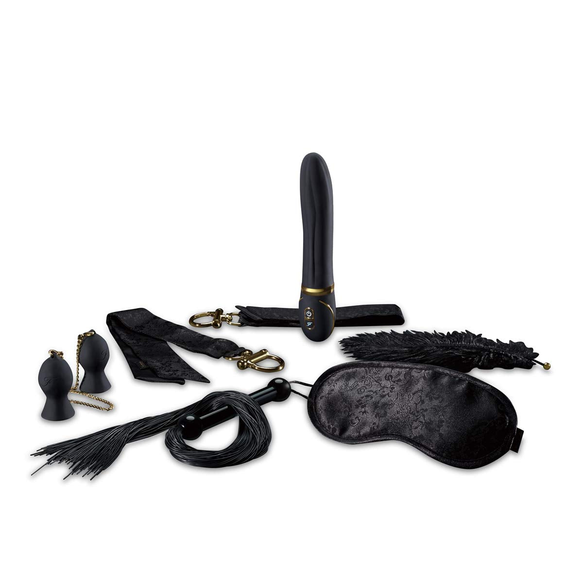 A: The set includes a rechargeable G-Spot Vibrator, a vibrating ring, four Velcro cuffs, and a spanker tickler, all designed to enhance intimacy and pleasure.