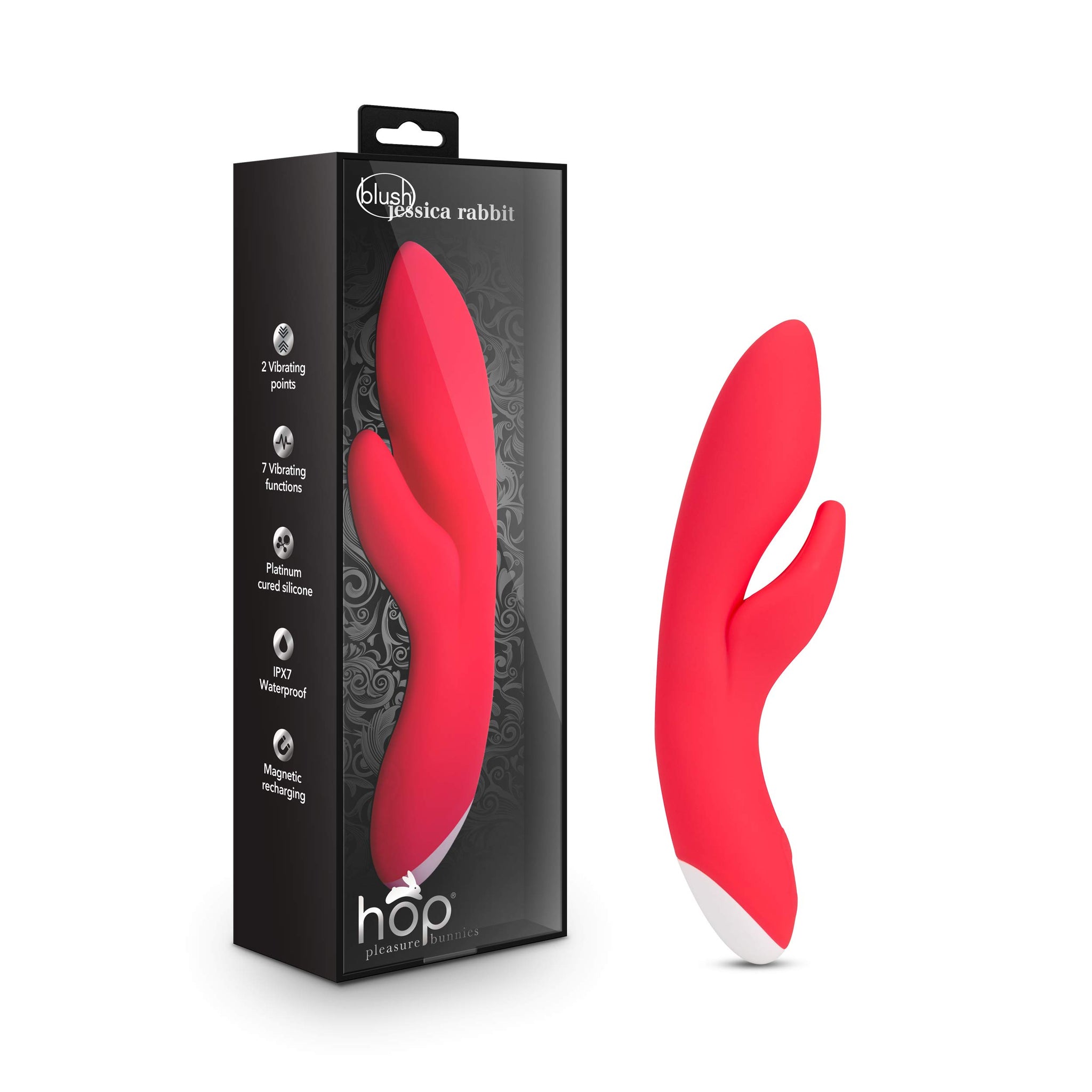A: The Hop - Jessica Rabbit vibrator features deep rumbly vibrations with 3 speed settings and 4 unique rhythms, dual vibrating points for G-spot and clitoral stimulation, and is made from pure platinum cured soft silicone that is safe for the body.
