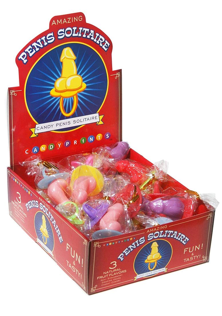 (WD) Amazing Penis Solitaire fun and tasty Penis Ring lollipops with 3 natural fruit flavors: Sexy Strawberry, Wet Watermelon and Cherry. Individually wrapped assorted fruit flavors. Plastic ring is a one size fits most. Thirty 1.05 ounces pieces counte