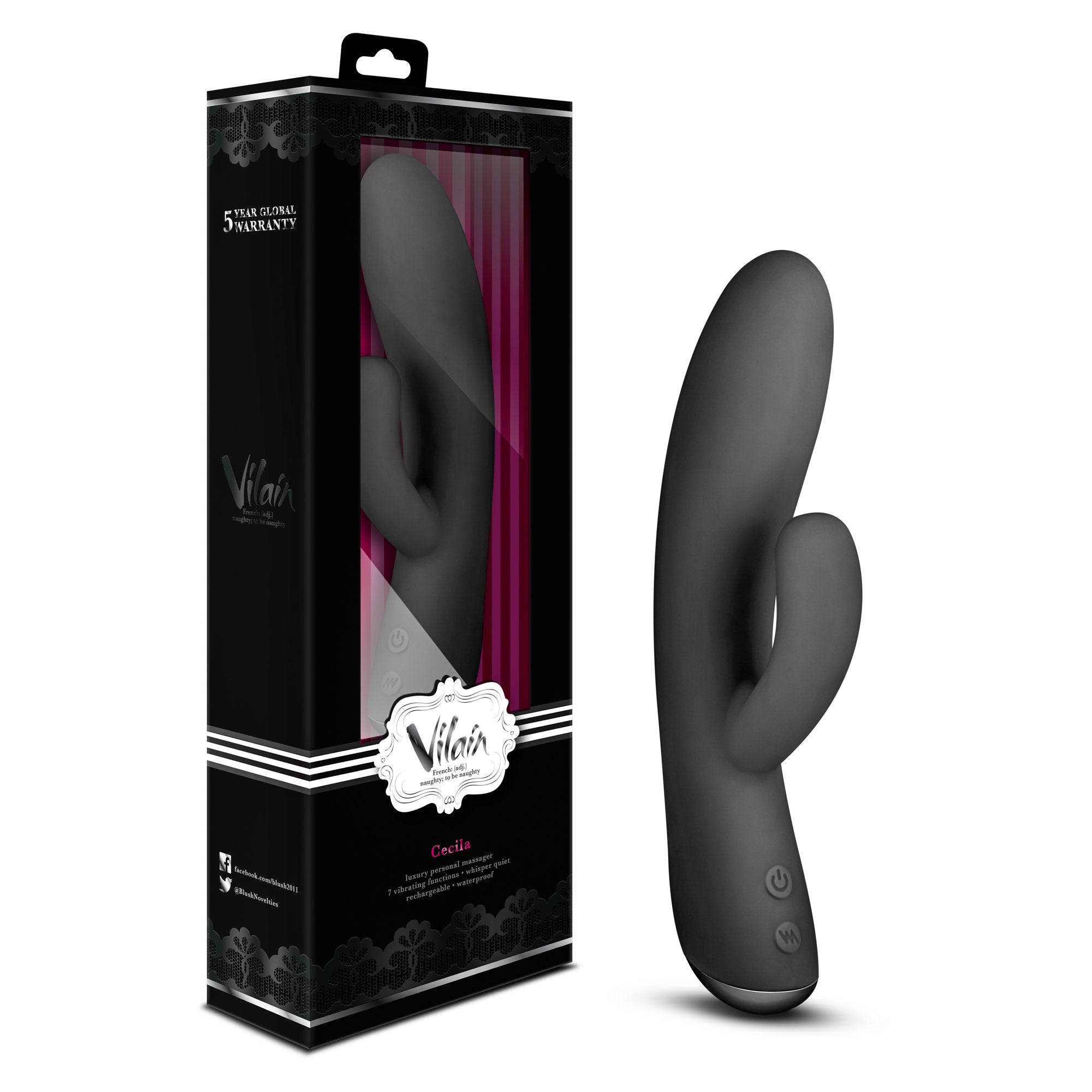 Blush Novelties Vilain Cecilia Black Rabbit Vibrator. A Perfect Dual Stimulating Vibrator. Vibrations Emanate From The Tip Of The Body And From The Clitoral Stimulator. Soft Flexible Body Conforms To Your Body. Smooth Satiny Finish Glides Like Silk Across