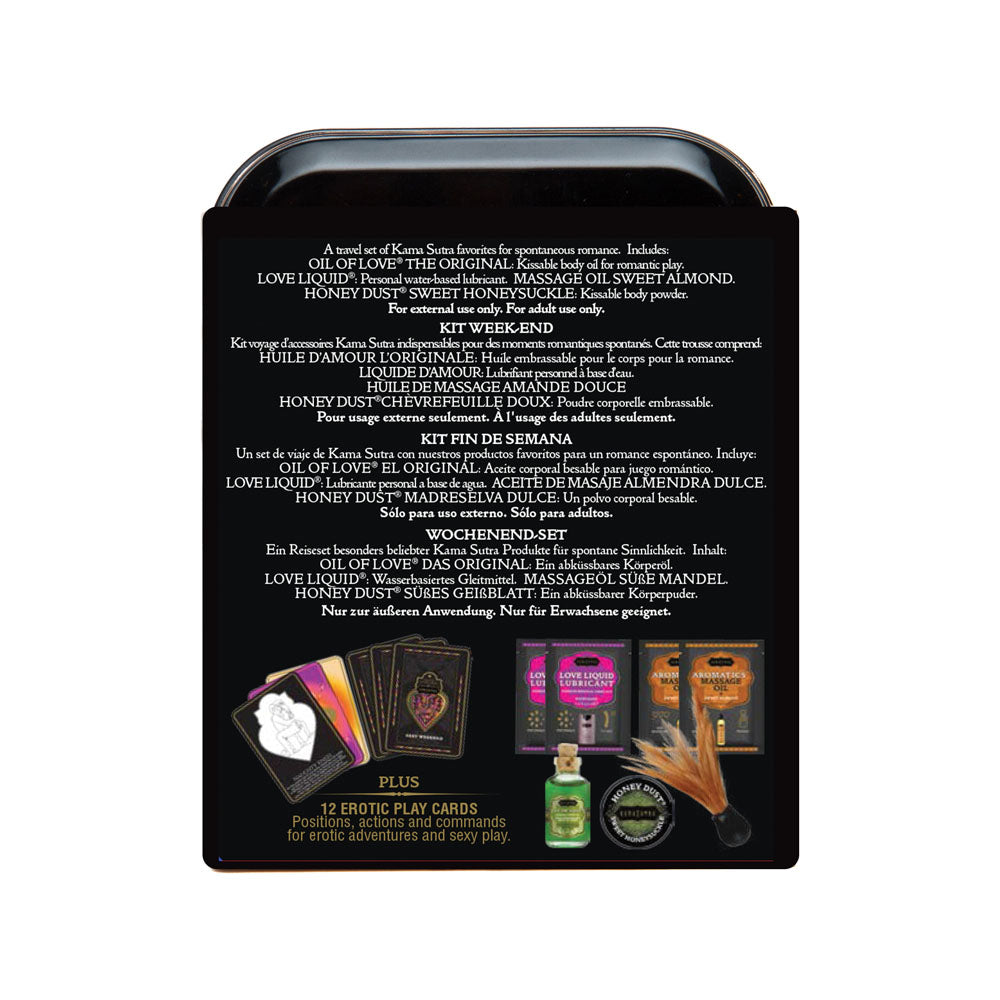 Q: How should I store the Kama Sutra Weekender Kit?A: Store the Kama Sutra Weekender Kit in a cool, dry place, away from direct sunlight and heat, to maintain the quality of the products.