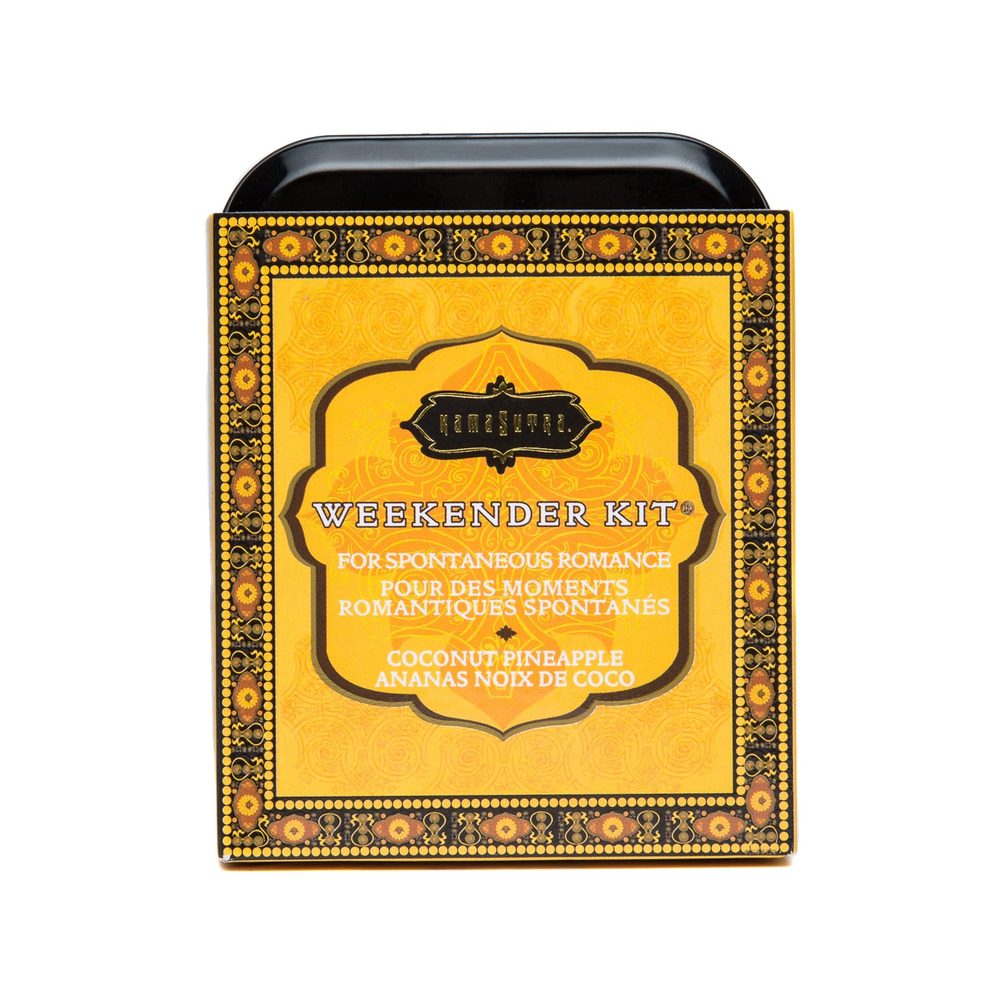Kama Sutra Weekender Kit Coconut Pineapple. The all new Weekender Kit is here! Be ready for spontaneous romance with these petite sensual Kama Sutra luxuries. Perfect portions fit comfortably in a pocket, luggage, bag or purse for a weekend away, now avai