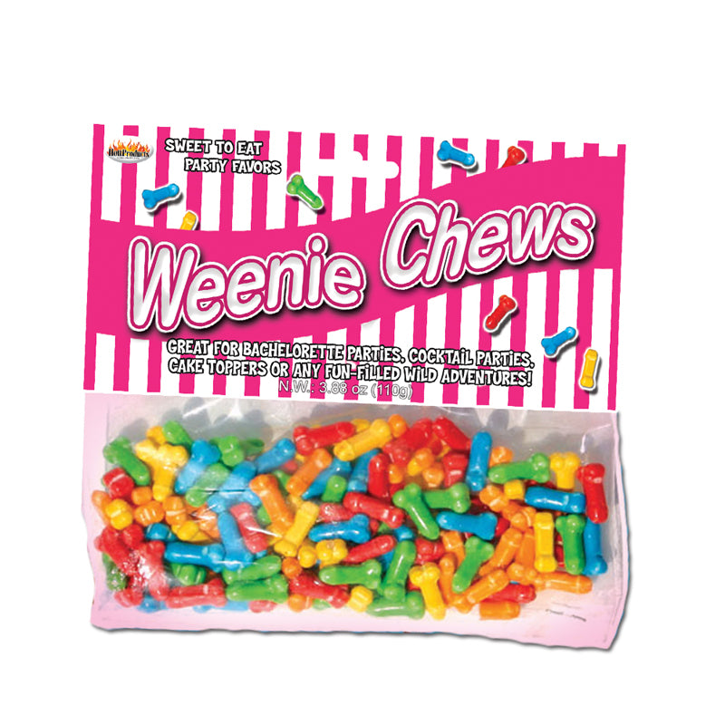 Q: What are Hott Products Weenie Chews?A: Hott Products Weenie Chews are penis-shaped assorted fruit candies designed for fun occasions like bachelorette parties and birthday celebrations.
