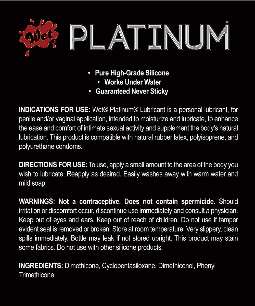 Q: What is Wet Platinum Silicone Based Lube used for?A: Wet Platinum Silicone Based Lube is designed to enhance intimacy and pleasure for men, women, and couples. It provides a long-lasting glide, making it suitable for various intimate activities.