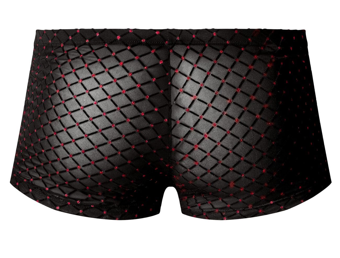 Q: What makes these boxer briefs different from regular underwear?A: The Widow Maker Mini Pouch Boxer Briefs feature a unique sheer mesh design and a provocative diamond pattern, setting them apart from standard underwear.