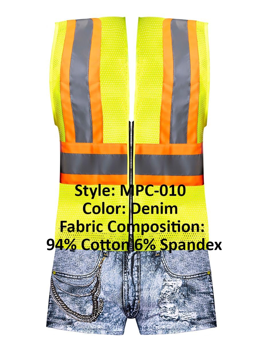 Q: What is the style of the shorts in this costume?A: The shorts feature a denim-inspired design, providing a casual and stylish contrast to the reflective safety vest.