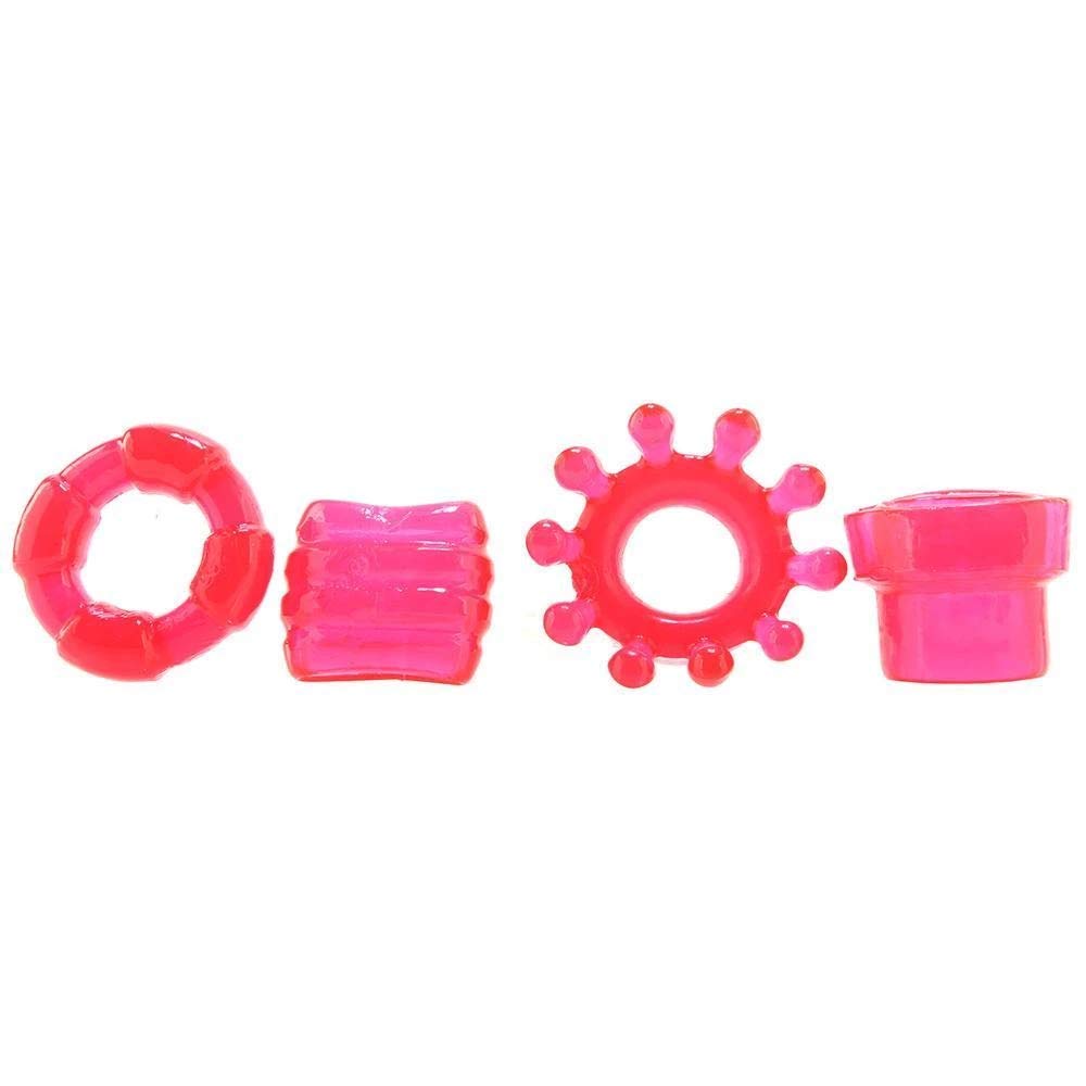 Q: What sizes do the cock rings in this set come in?A: The sizes of the cock rings in the set are as follows: The Cuff stretches from 1.18" (2.99cm) in diameter, the Lifesaver from .60" (1.5cm), the Bottleneck from 1.25" (3.2cm), and the Tickler from .81" (2cm).