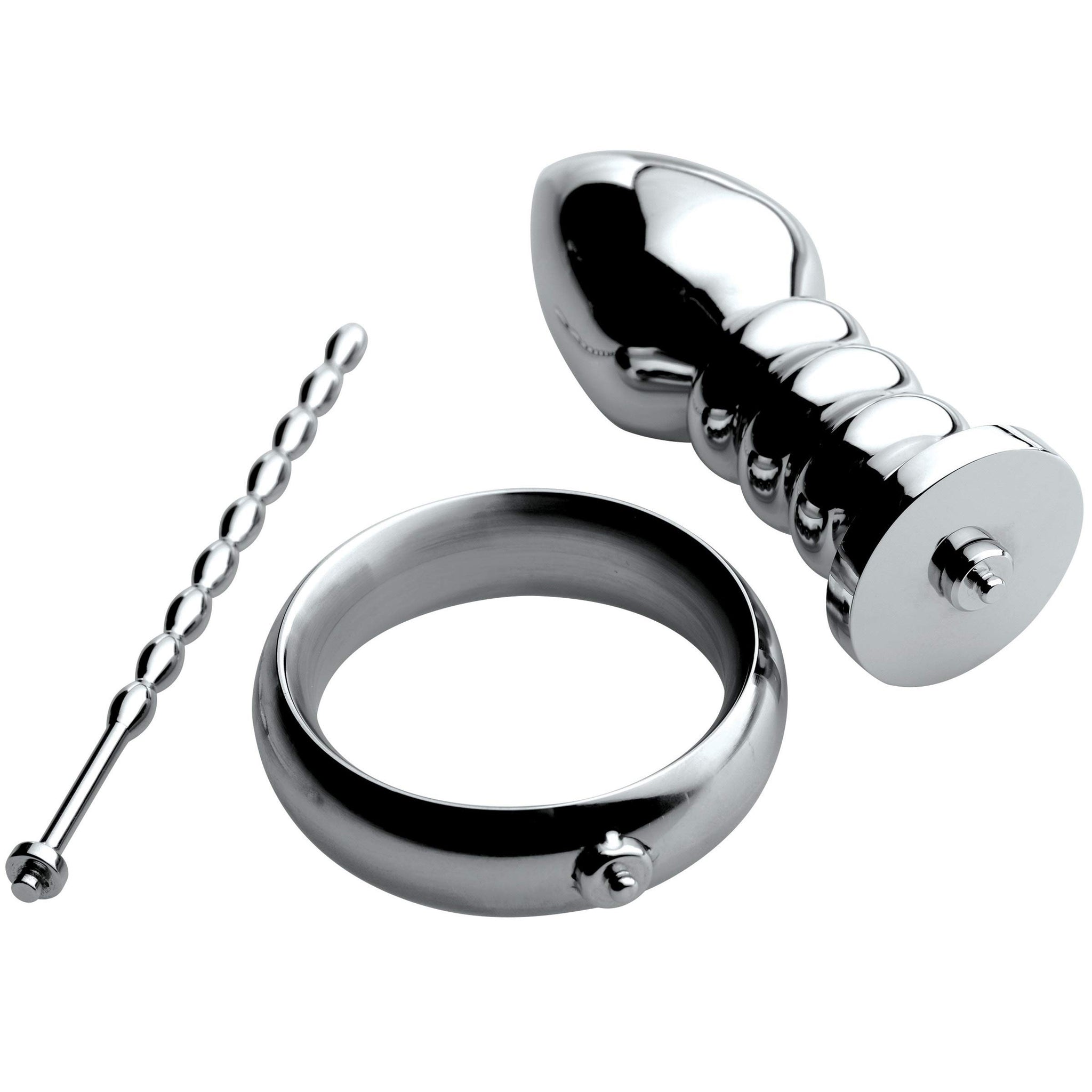 Q: What are the dimensions of the attachments in the kit?A: The cock ring has an internal diameter of 2 inches, the urethral plug measures 4.75 inches in length and .15 inches in diameter, while the anal plug is 4 inches long and 1.5 inches at its widest point.